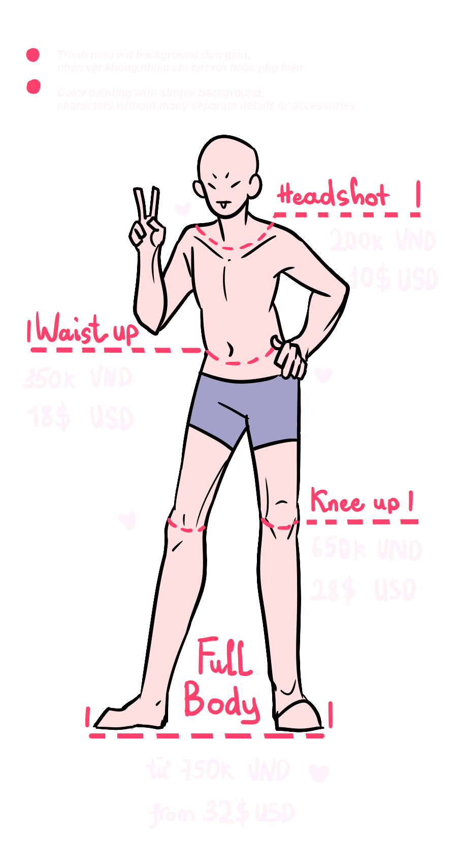 Tranh full render và hiệu ứng cơ bản - Full rendered painting and basic effectsHeadshot (từ đầu tới vai): 200k (VND) - 10$ (USD)Waist up (từ eo trở lên): 350k (VND) - 18$ (USD)Knee up (từ đầu gối trở lên): 650k (VND) - 28$ (USD)Full body: từ 750k tùy mức độ phức tạp của char (VND) - from 32$ depending on the complex of the character (USD)